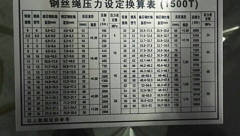 首先模具和鋁套型號是必須對應的,比如6mm鋁套就用6#壓套機模具,8mm鋁套就用8#模具,而鋼絲繩的尺寸不一定是整數(shù),廠家配的模具正常都是偶數(shù)配,壓到?jīng)]對應尺寸的鋼絲繩,這點不用擔心,模具都是有壓制范圍的,正常用1mm的上下范圍,比如15mm的鋼絲繩,可以用14mm或16mm的模具,總之最好的分別方法就是,不管鋼絲繩的尺寸是多少,找數(shù)值離得最近的模具就壓就可以了。還有一個重點,剛剛說的情況都是麻芯的鋼絲繩,而鋼芯的鋼絲繩正常都是比麻芯的鋼絲繩所用模具大一個型號。參數(shù)這樣的方法,客戶在使用鋼絲繩壓套機模具時就不會不知道如果選擇了。